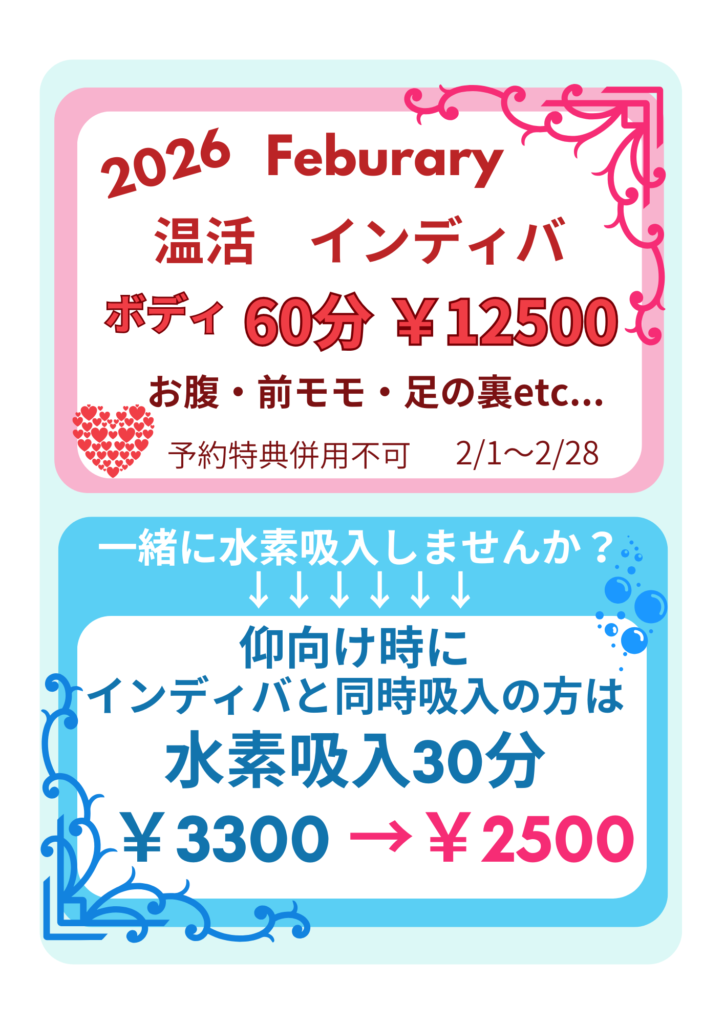 インディバ60分(お腹+脚)&水素(同時)吸入20分